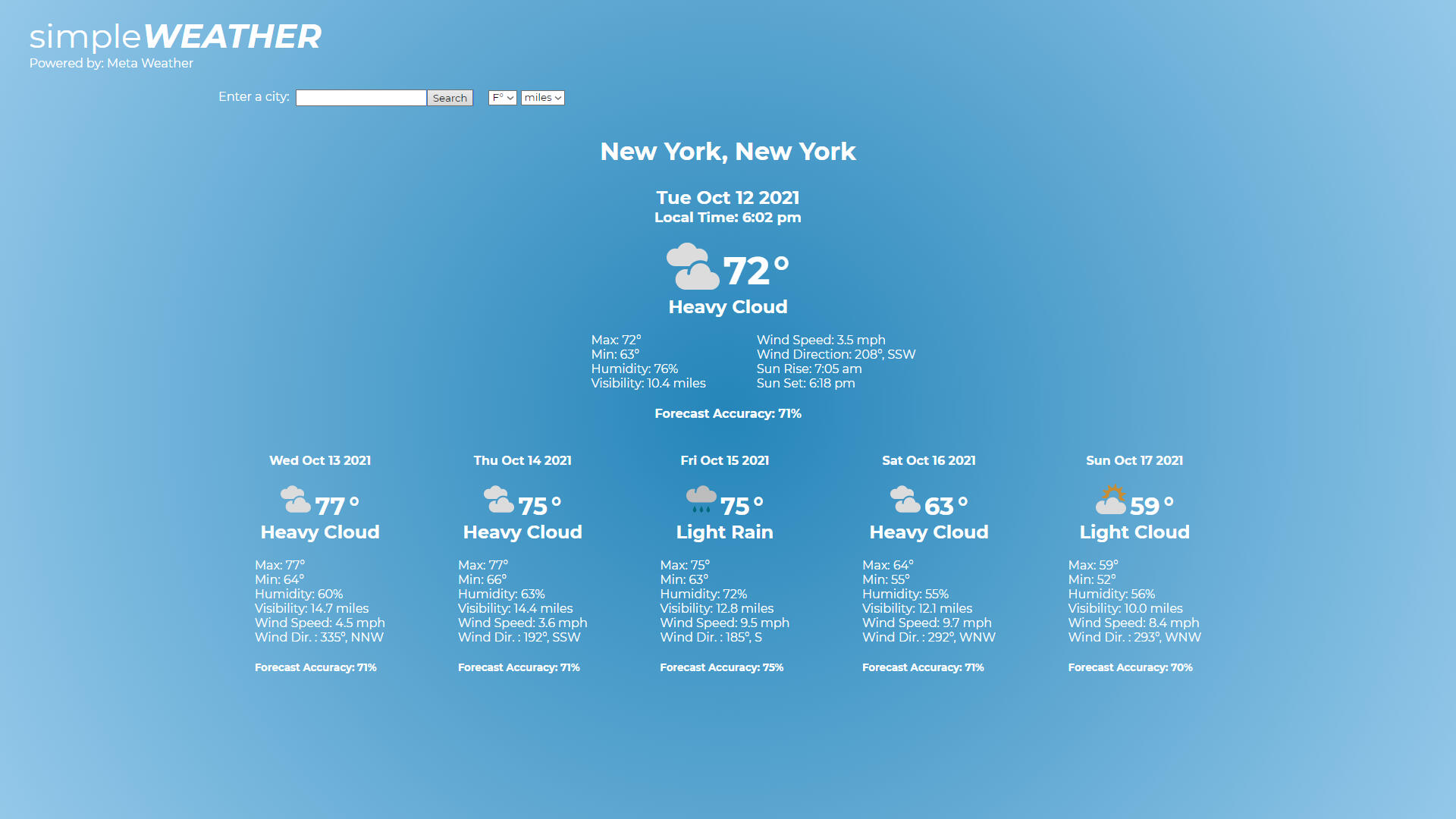 A simple weather application written in JavaScript. The application gets the weather information by making calls to the Meta Weather api, formats and displays the weather data using HTML and CSS.